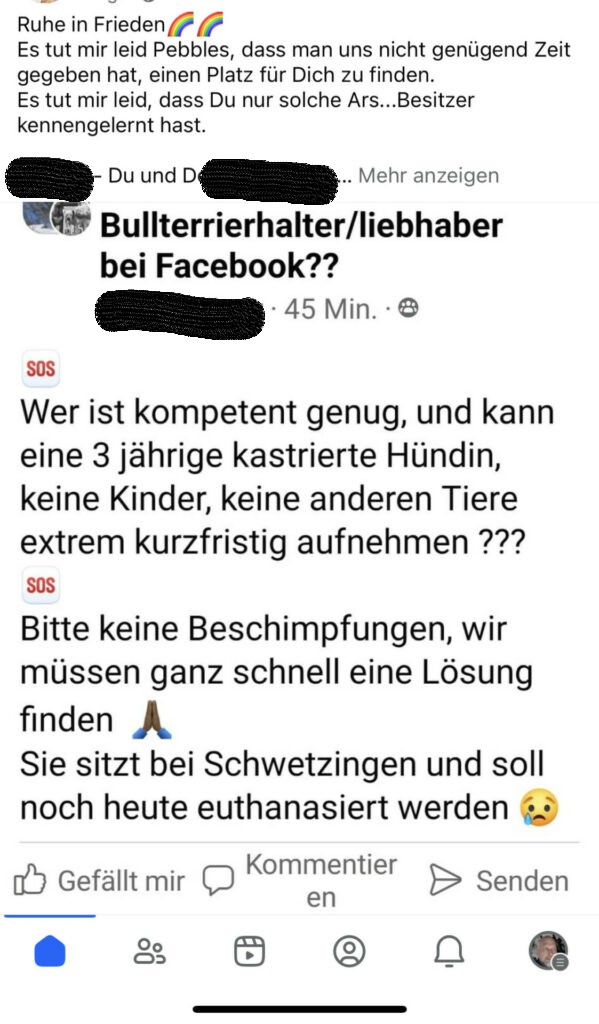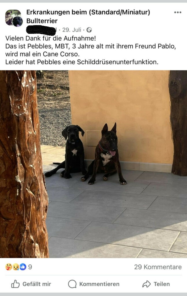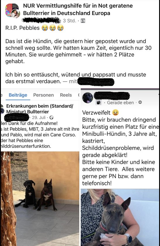 Was war passiert? Ich las meine üblichen FB Gruppen, wieder mal ganz viel nix, doch dann las ich folgenden Post, einer guten Freundin die es sich in ihrer Freizeit, ehrenamtlich zur Aufgabe gemacht hat in Not geratene Hunde, in diesem Fall eine Miniaturbullterrier Hündin zu kümmern.